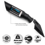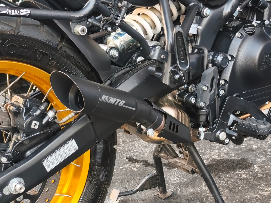 O escapamento MTG® possui característica de performance e qualidade de materiais com padrão internacional. Fabricado em aço inox liga 304 com paredes de milimetrarem dimensionada para menor peso, flauta interna rígida envolvida por lã cerâmica acústica isolando termicamente a pare externa do escapamento, guiando os gases pressurizados do motor de forma a não se perder energia e garantindo melhor fluxo do ar e mais desempenho, sendo obtidos ganhos de até 4 hp de potência e 2,9 Nm de torque. A ponteira além de muito leve, reduzindo significativamente o peso da moto, também proporciona melhor arrefecimento do motor que trabalha mais frio, filtragem eficiente de tons agudos, gerando um ronco moderado em quaisquer faixas de rpm e grave em baixas. A MTG® projeta seus produtos com design minimalista, dimensões reduzidas e excelência dos detalhes de acabamento, resultando num visual limpo e moderno para a motocicleta.   – Cores disponíveis: inox – diâmetro: 63mm – comprimento 30 cm – Peso: 870 gramas – Instalação: instalação simples sem adaptação – Material: inox liga 304 – Nível sonoro: moderado – Efeito: esportivo – Miolo interno: sim – lã interna: sim – Acabamento: preto texturizado – Itens desse anuncio: (01) ponteira com abafador mini 1 MTG (01) escudo proteção e acabamento MTG – Compatibilidade: royal enfield himalayan 450 (NÃO SERVE NA HIMALAYAN 411) – Marca: MTG